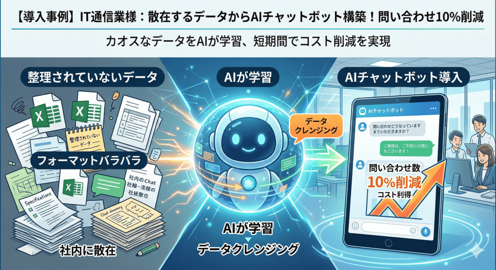 提供するサービスが多岐にわたり、日々膨大なユーザーからの質問が寄せられるIT通信業界。B社では、増加し続ける問い合わせ対応によるサポートコストの肥大化が大きな課題となっていました。 今回は、社内に散らばる「整理されていないデータ」を活用し、短期間でAIチャットボットを導入。問い合わせ件数の10%削減という確実なコストダウンを実現したプロジェクトの裏側に迫ります。